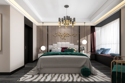 臥室以潔凈的空間為基礎(chǔ),灰色的木質(zhì)地板搭配上木質(zhì)床板的協(xié)調(diào)統(tǒng)一性,使整個空間簡單整潔。以金屬軟裝作為床頭墻,與金屬吊燈十分協(xié)調(diào)。綠色寢具和座椅,以清新素雅之感,傳達著一種自然舒心的生活態(tài)度。