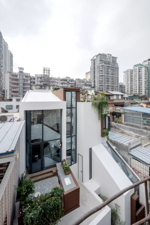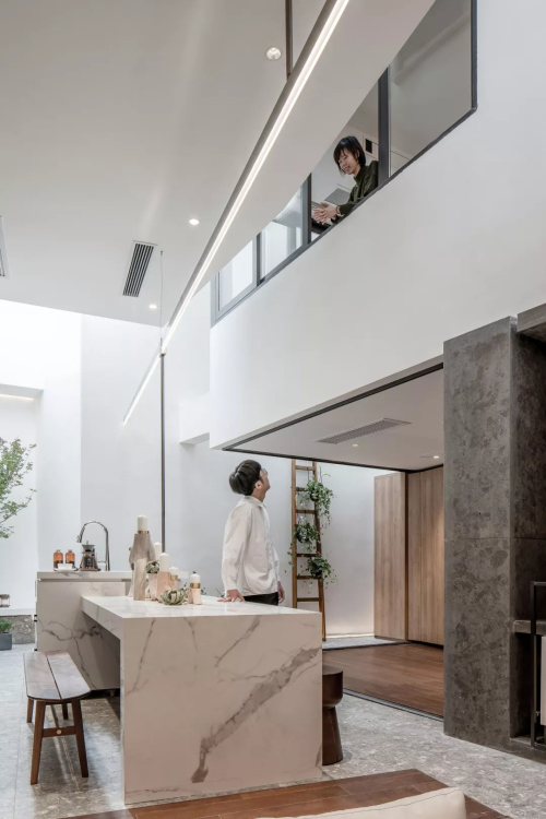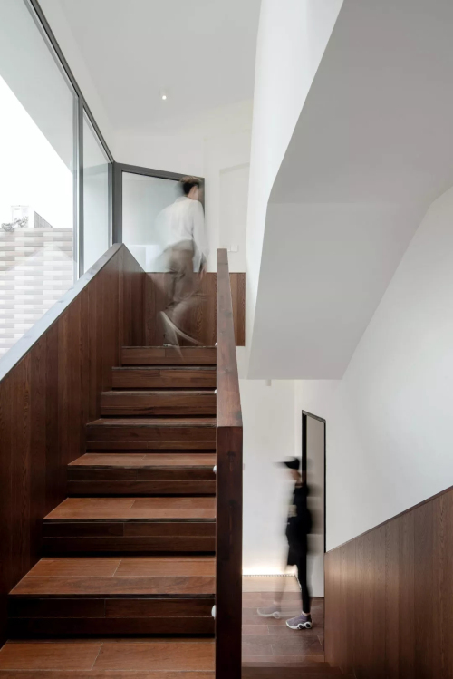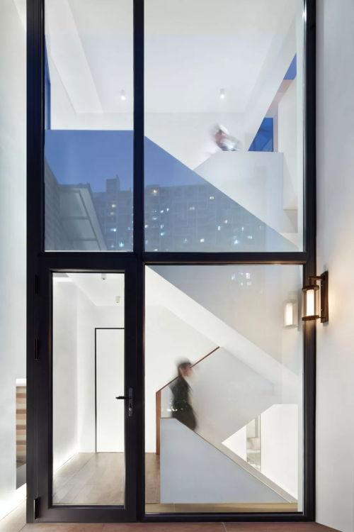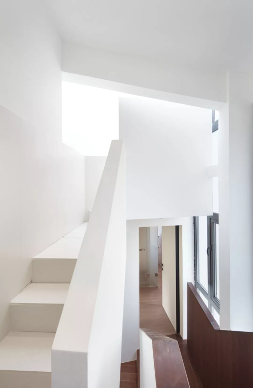 改造后的房子一改陰暗的面貌,整棟建筑分成兩側(cè),在滿足委托人空間使用需求的同時,使中間形成天井,傾瀉而下的日光在建筑的中心位置上創(chuàng)造出一種豎向的動態(tài)感,將自然光線引入到每一個空間,改善室內(nèi)的通風(fēng)情況。
