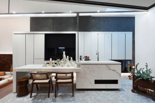 考慮到顏色與性能,設(shè)計師謝英凱選用選擇環(huán)保、安全性高、防滑、抗磨損的材料——冠珠魔術(shù)師巖板(極地白)作為樓梯間、衛(wèi)生間、入戶花園等空間的裝飾,不僅可以隨意裁切,定制家具,大面積鋪貼延伸不重復(fù),還可以選擇不同的光感,給予居住者更多的舒適體驗。