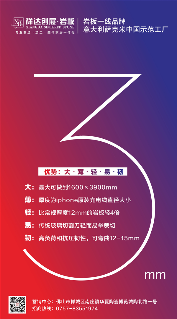 基于超薄巖板的多應(yīng)用性,有優(yōu)越物理性能的產(chǎn)品基因和多樣的花色紋理做支撐,祥達創(chuàng)展3MM超薄超大巖板的量產(chǎn),將成為打開全面“定制化”大門的金鑰匙。