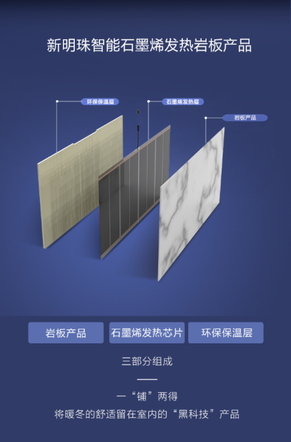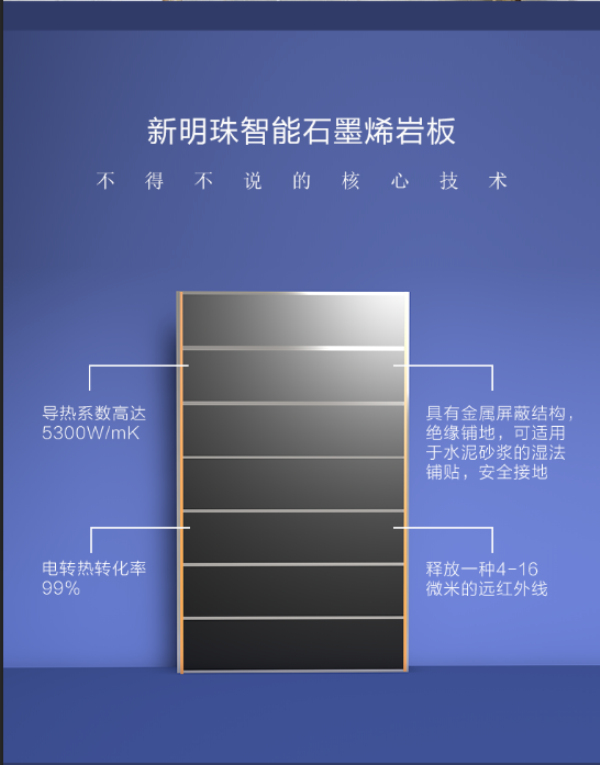 智能石墨烯巖板產(chǎn)品采用巖板產(chǎn)品、智能石墨烯發(fā)熱芯片、環(huán)保保溫層三層保護設計,真正實現(xiàn)了高效發(fā)熱、“0漏電”,相較于傳統(tǒng)的采暖方式要節(jié)能35%。