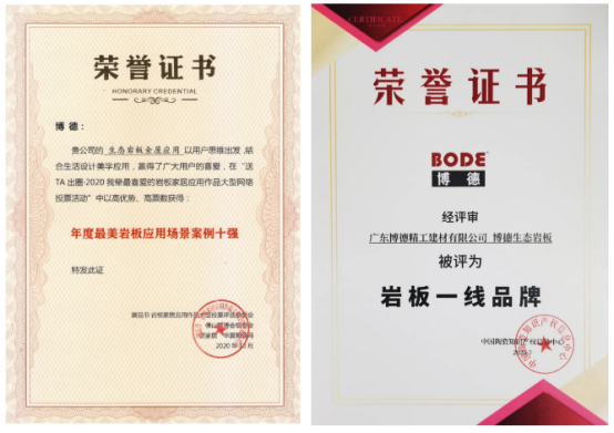 博德生態(tài)巖板憑借優(yōu)越的性能、豐富的應用方式獲得行業(yè)的認可與表彰,今年曾獲“最美巖板應用場景案例十強”,“巖板一線品牌”稱號。