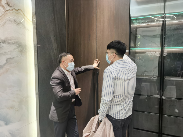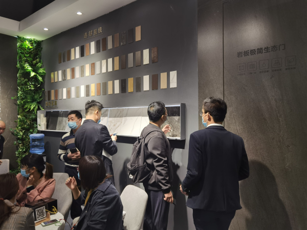 ▲參觀者對(duì)3mm超薄巖板十分感興趣,上圖客戶(hù)在觀摩3mm巖板的實(shí)際應(yīng)用效果